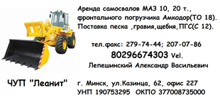 Предоставляем в аренду с экипажем: погрузчики фронтальные с ковшом, Амкодор 332, ТО-18,2 м куб, самосвалы грузоподъемностью 10, 20 тонн. Доставляем Песок, Гравий, ПГС, цементные и известковые растворы. Вывозим строительный мусор. Возможна доставка тарированного по 25-50 кг песка и гравия. Доставка тарированного цемента, мела, керамзита, шпатлевок, клея ПВА, клеевых растворов.